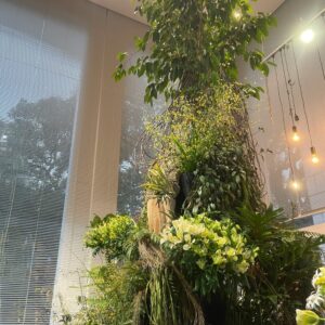中心には「永久の幸せ」を象徴するフィカス・ストリクタを据え、丸みを帯びた葉が上向きに伸びる姿から「陽」の気を放ち、空間の気の流れを整えるとともに、